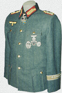 It was also common for combat officers of all ranks right up to general to convert issue enlisted field blouses. These conversions ranged from merely badging up an issue M43, as in the case of Mantueffel, all the way up to extensive retailoring with the addition of pointed collar, french cuffs, shortened skirt, and dagger hanger slit. We do this conversion frequently. For details and photos, click here.