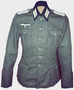 We receive inquiries about our officers uniforms almost every day from people who are concerned about getting "officer quality" material (something they read in a book). This always brings us a chuckle, because officers' and enlisted men's field blouses were all made of felted wool ( in several weaves, but always felted). No difference at all. Even visor caps and old style field caps that were intended for field use were made of the same material due to its weather resistant qualities (North Central Europe tends to be cool and damp). Officers' uniforms intended for office wear and semi-dress uniforms, or even duty uniforms for around the kaserne are a totally different topic. Those can be found made of everything; doeskin, gabardine, whipcord, you name it. In many cases, these ended up being used in the field, but this is also true of converted waffenrocks. It was something never really intended. Currently, we only make the field uniform in the felted wool.