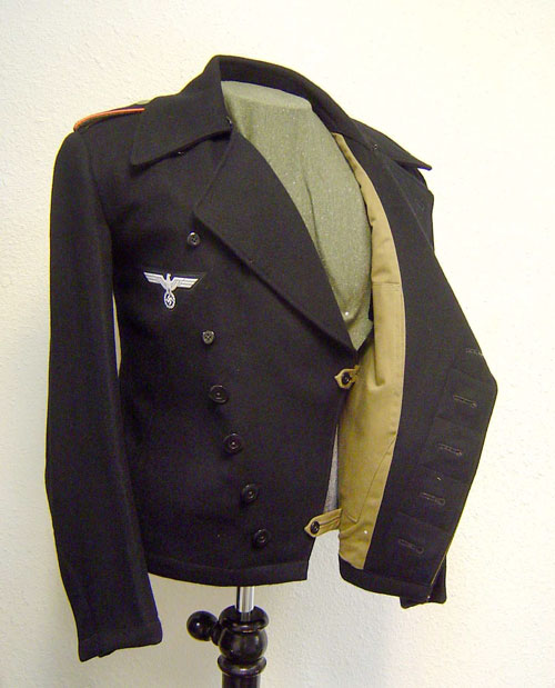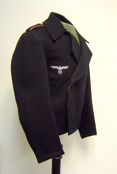 The famous black Panzer uniform (Sonderbekleidung der Deutschen Panzertruppen) was introduced to the Army in 1934. Heinz Guderian, Inspector of Panzer Troops, had been thinking about what to do for a new uniform that would be unique to armored crewmen of his new Panzer arm when he went on a ski trip and saw a new style of short jacket for Alpine skiing that had a double breasted closure, but almost no visible buttons for modern, streamlined look. The jacket could be worn open with a turtle neck sweater or closed all the way up. Guderian quickly adopted the jacket, along with the ski trousers that went with it, as his new Panzer uniform. In black wool, it was reminiscent of the Napoleanic-era Braunschweig Hussars with their black jackets and silver death's head insignia. Black also had the added advantage of not showing grease and oil quite so badly.