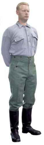 The photo at left shows the M40 style trousers in field gray. Roll your mouse over the photo for the back view. We also offer the M36 stone-gray trousers in stone gray.