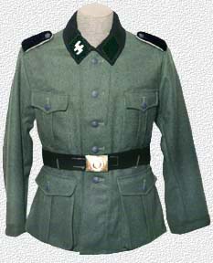 This field gray jacket is completely identical to the Army's M36 field blouse, but has SS insignia. In 1938, Sepp D!ietrich ordered a shipment of these uniforms for the LAH Regiment from SS contractors who were also suppliers to the German Army. Both the Army and Himmler were irate when elements of the LAH turned out wearing these jackets, but Dietrich had Hitler's backing so they kept them. It's unknown today which units received the Army style blouses, but use seems to have been limited to certain occasions since the Waffen-SS M37 continued to be issued. When the LAH was expanded to divisional strength, personnel received both Waffen-SS M39 and Army-style blouses. When units of the dreaded Totenkopfverbände were amalgamated and expanded into the Totenkopf Division, many of the newcomers also received the Army-style blouses although the bulk of the division wore the Waffen-SS M37.